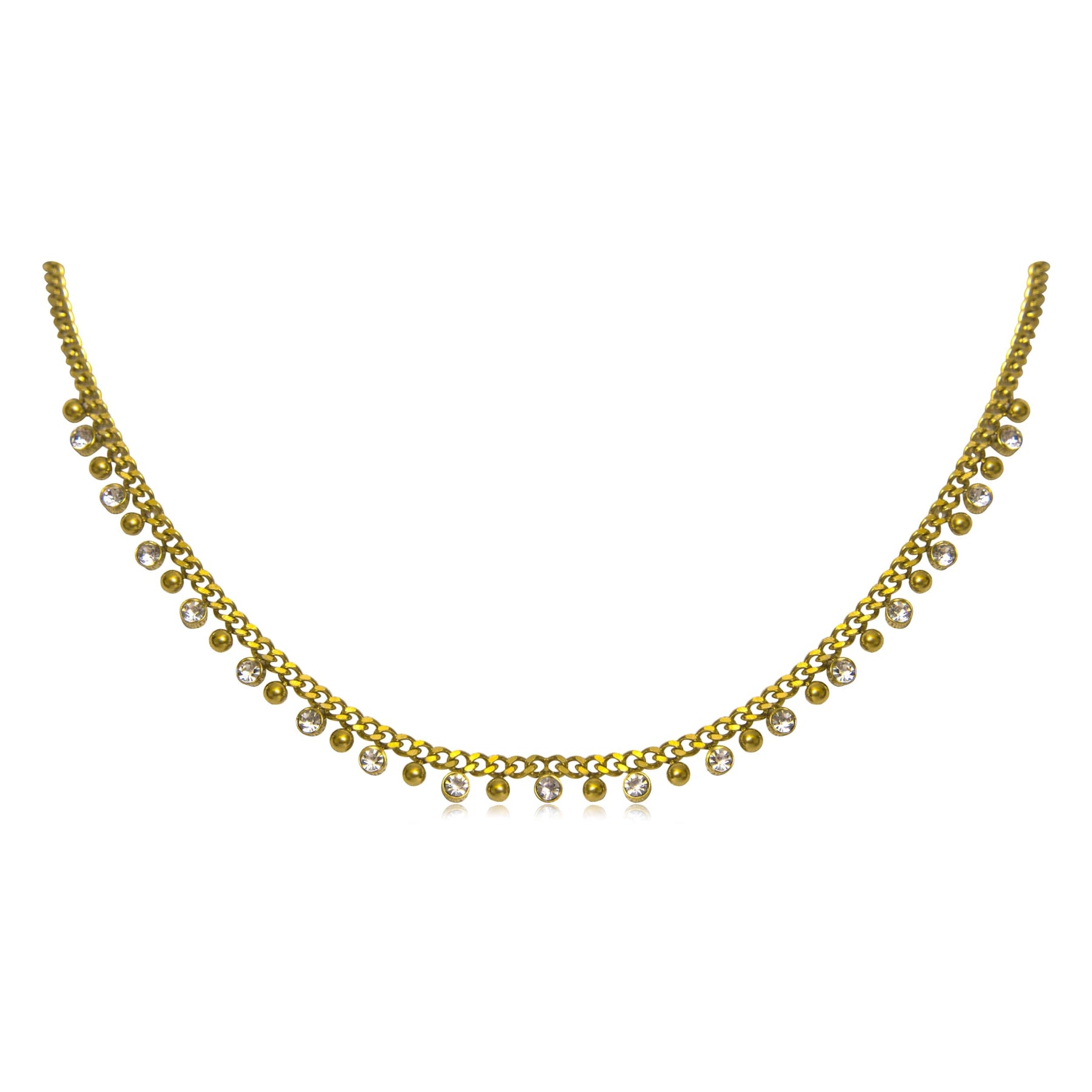 Our Andrea Necklace exudes a cultural influence, featuring bead balls and sparkling stone charm drops set in a fringe chandelier dripping on a chain. More than just beautiful, this pretty necklace is also timeless with its unique design.