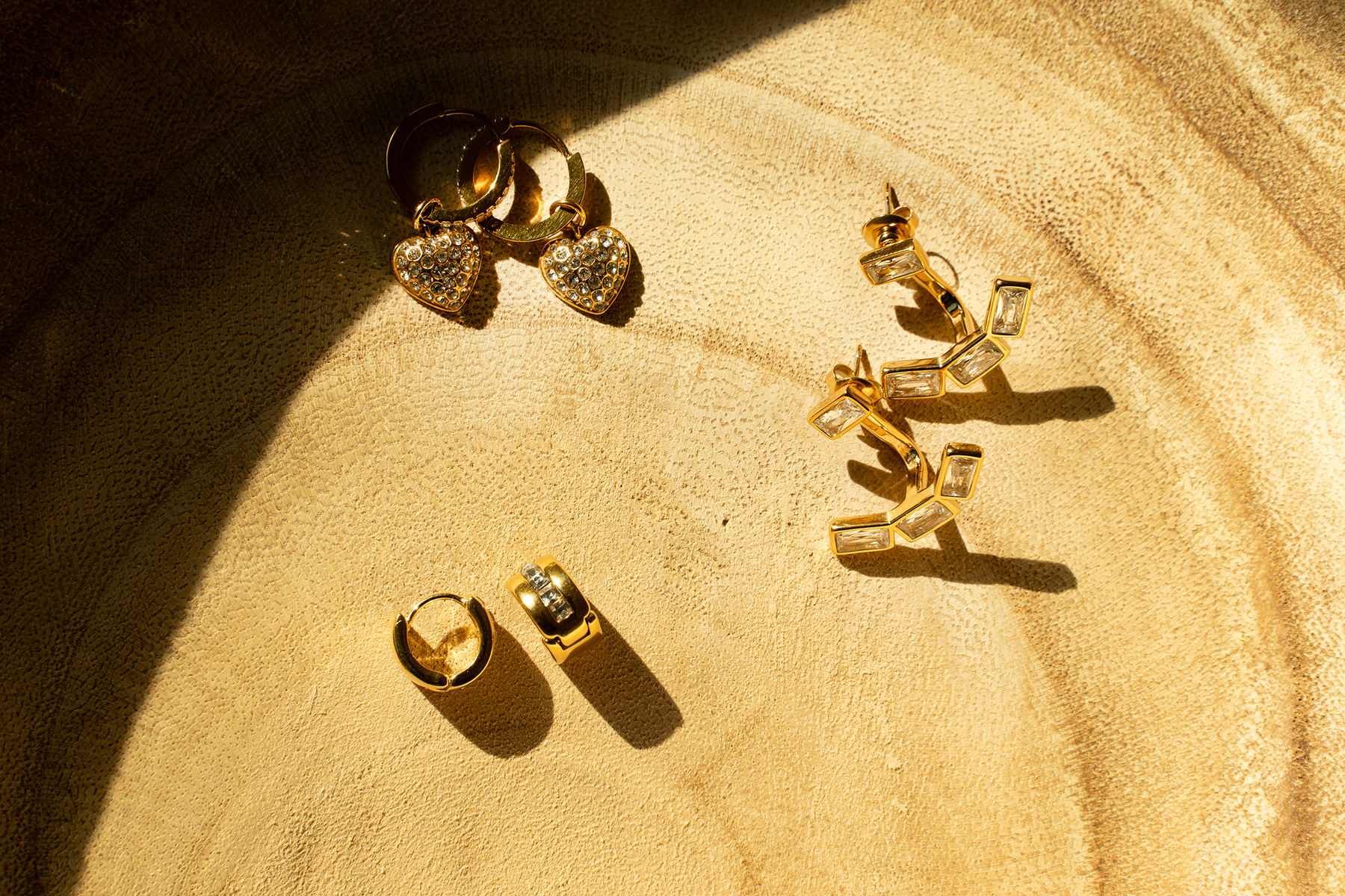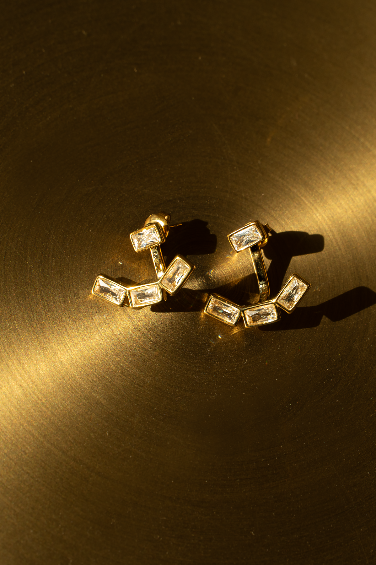 Modern gold-tone earrings featuring sleek baguette-cut stones in a bold geometric arrangement. A structured drop design creates a chic, angular silhouette with clean lines. Minimal yet eye-catching, perfect for adding contemporary elegance to any look.