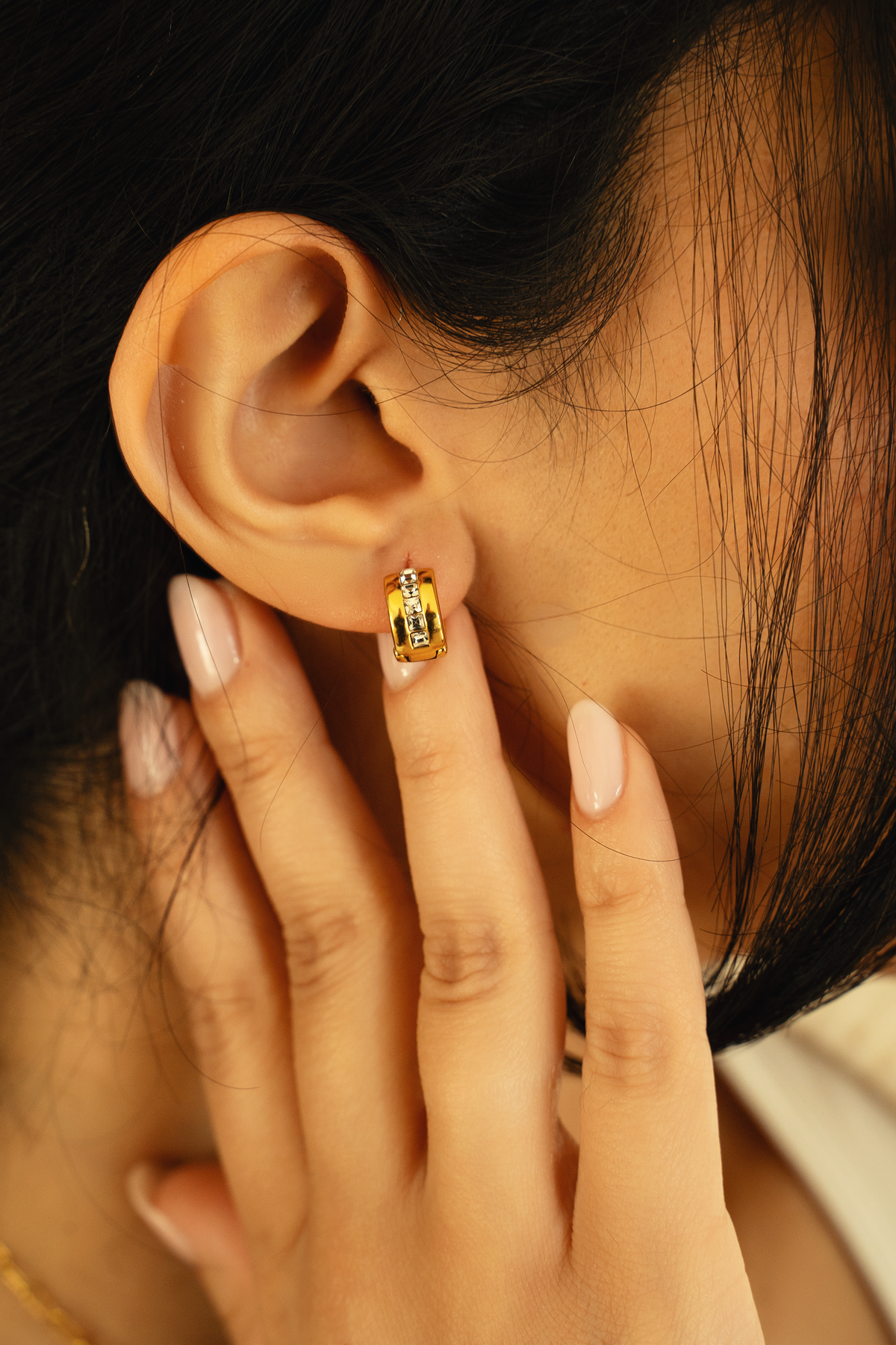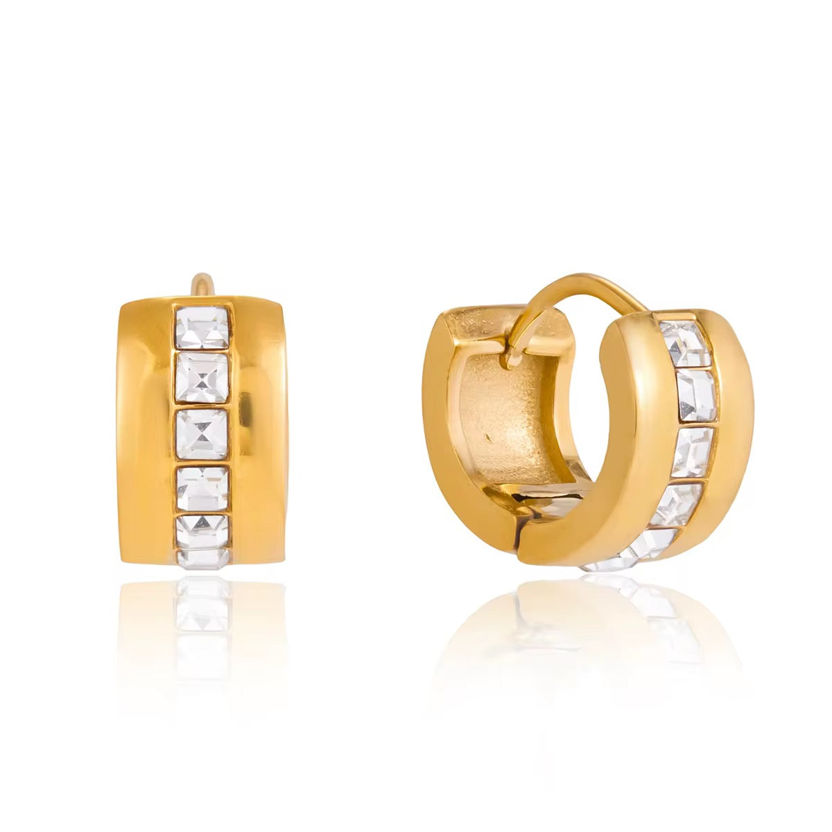 These elegant gold-toned hoop earrings feature a bold, wide band with a polished finish for a modern look. A central row of square-cut clear crystals adds a sophisticated touch of sparkle and architectural detail. Designed with a secure hinge closure, they offer a seamless blend of everyday comfort and timeless luxury.