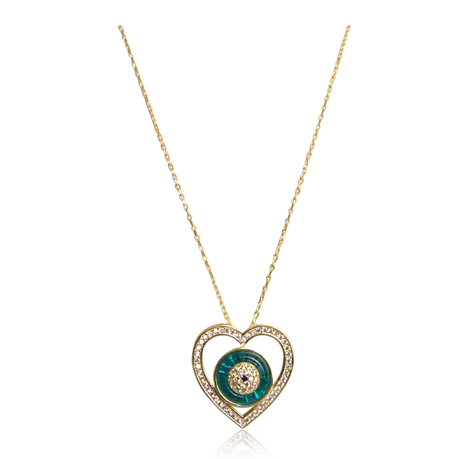 Ward off evil and keep abundant opportunities by your side wearing this dainty evil eye pendant, designed in a high shine. A turquoise cabochon sits nestled inside the eye, framed by a heart of sparkling cubic zirconias. Add a touch of magic to your everyday life and layer this delicate necklace with other jewelry.