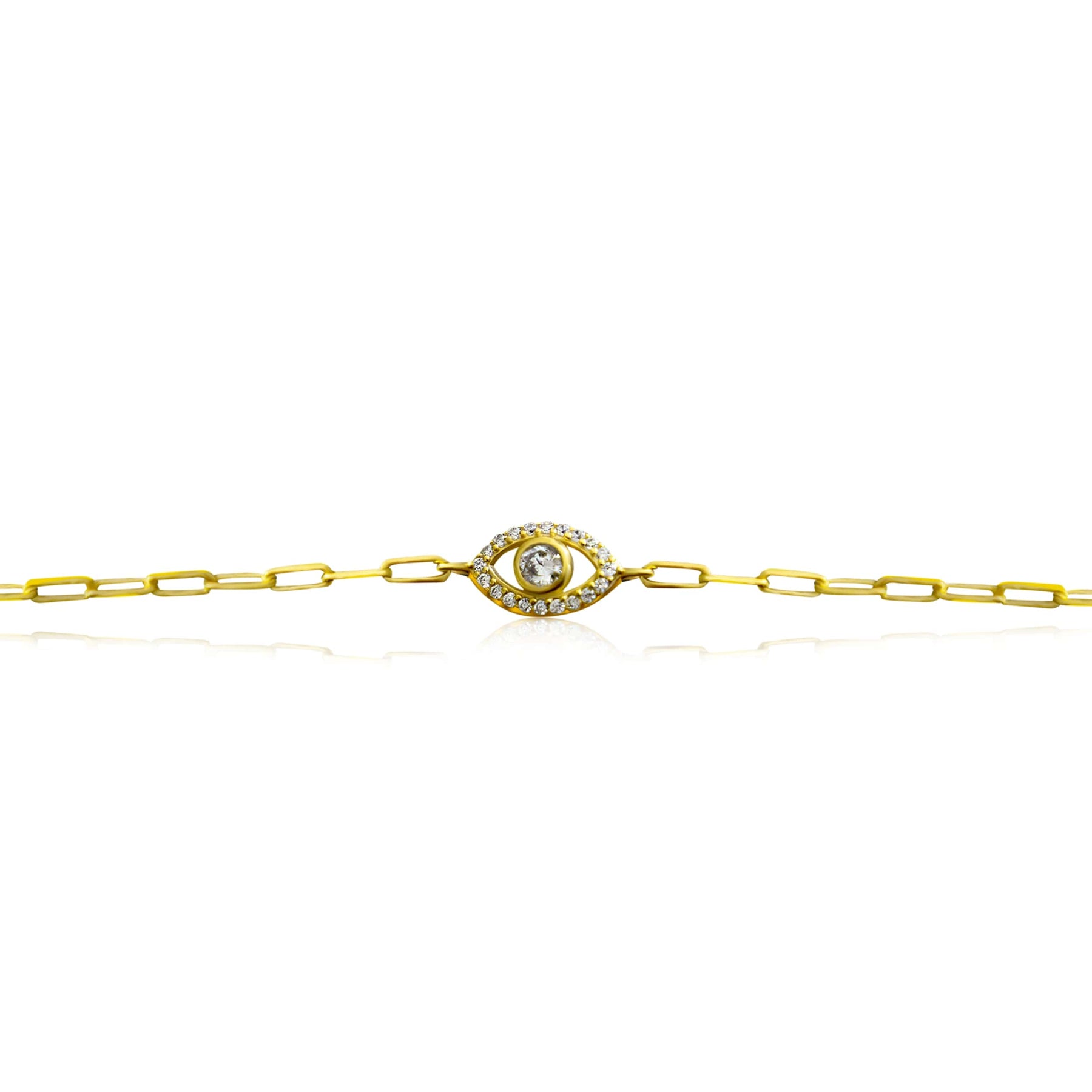 A delicate gold bracelet featuring an eye-shaped charm adorned with sparkling Cubic Zirconia. The intricate design exudes elegance and sophistication against a dark background.