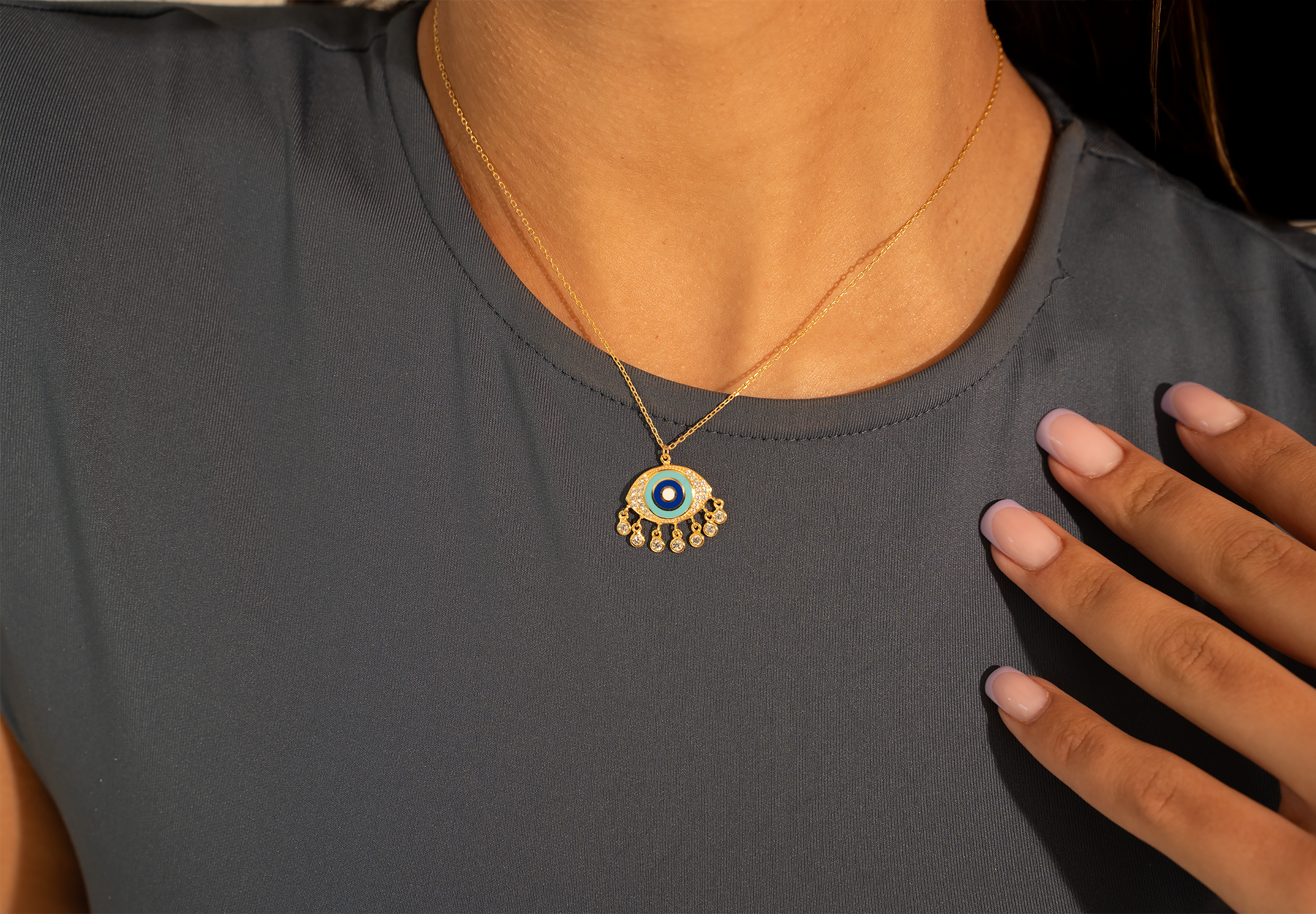 This is an elegant gold-toned necklace featuring a striking evil eye pendant. The eye is adorned with white crystals and a colorful enamel design in shades of blue and turquoise. Dainty crystal drops dangle from the bottom, adding sparkle and movement to this protective talisman.