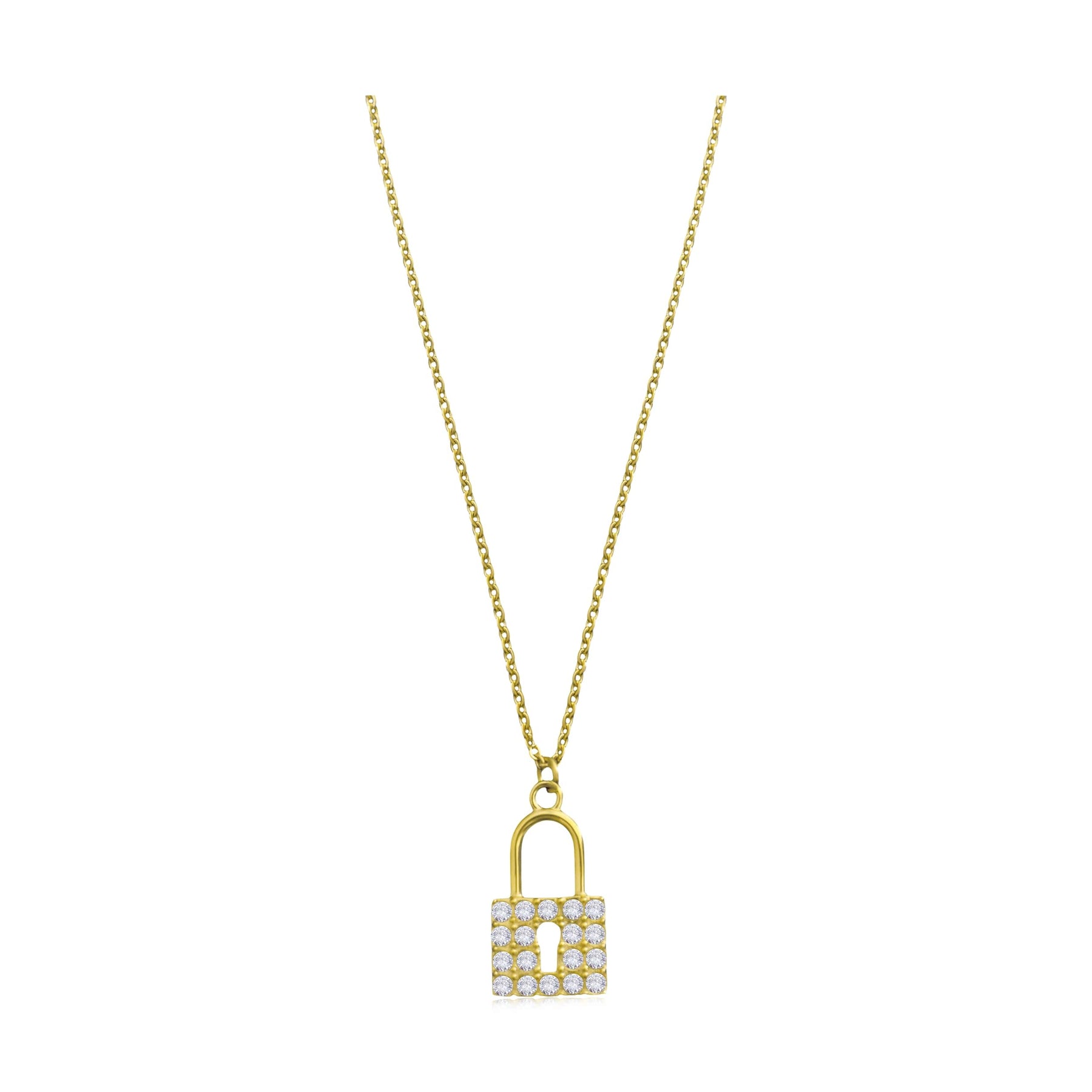 Elegant gold necklace featuring a sparkling diamond-studded padlock pendant. A symbol of love and security, this timeless piece adds a touch of luxury to any outfit.