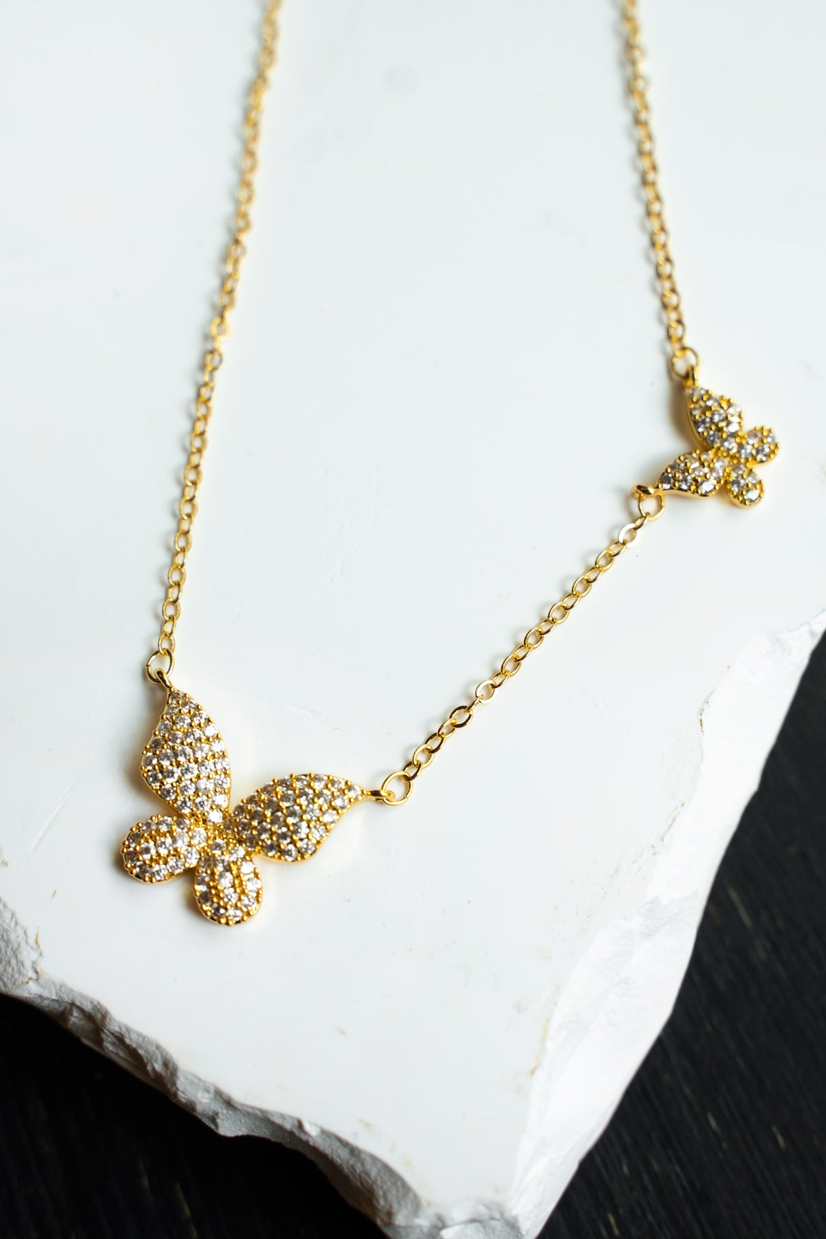 This elegant gold necklace features two sparkling butterfly pendants encrusted with tiny crystals. The asymmetrical design adds a modern and whimsical touch to a classic piece.