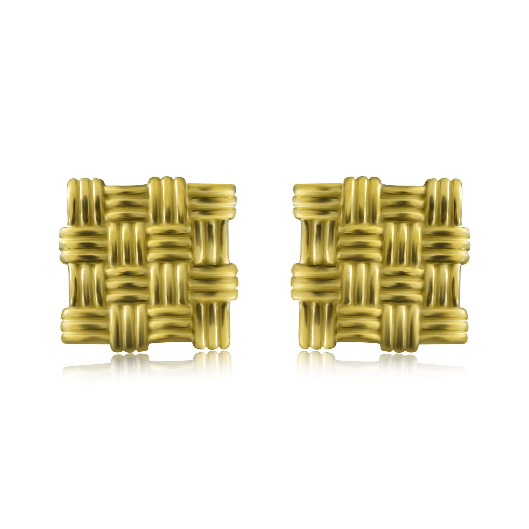 A pair of sophisticated gold stud earrings featuring a woven texture design that mimics an intricate basket weave pattern. The bold and structured look adds a touch of elegance and modernity.